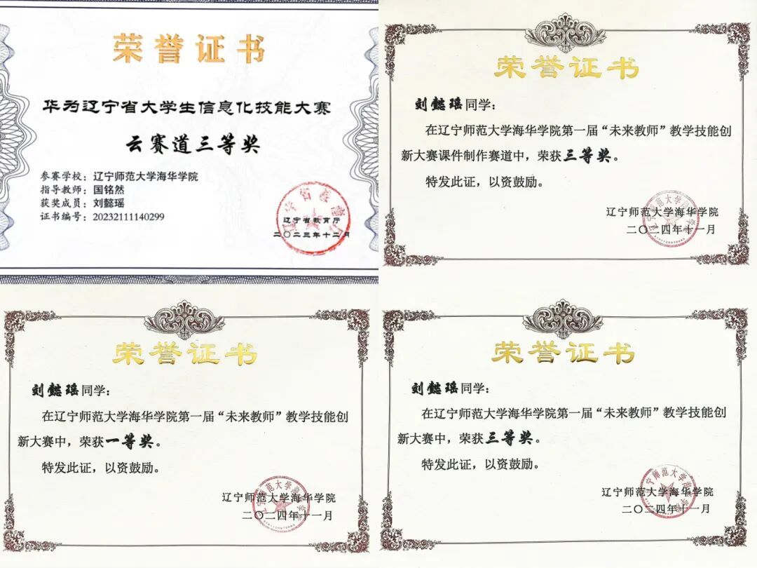 在学科竞赛与创新创业领域,她同样展现出卓越的综合实力,累计获得省、校级奖项十余项。其中包括2025年辽宁省“iTeach”数字化教育应用创新大赛(教育服务应用赛道)省级二等奖、2025年辽宁省大学生智慧农业创新创业大赛(B类智慧农业创新技术赛道)省级三等奖、2025年“中软国际——卓越杯”大数据挑战赛省级三等奖、2023年华为辽宁省大学生信息化技能大赛省级三等奖。
