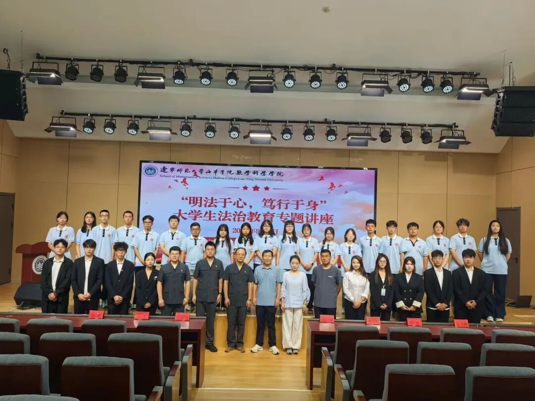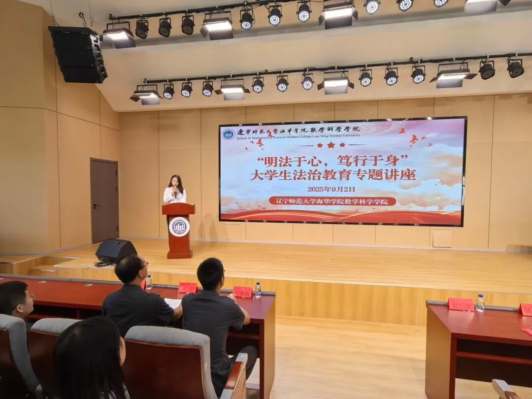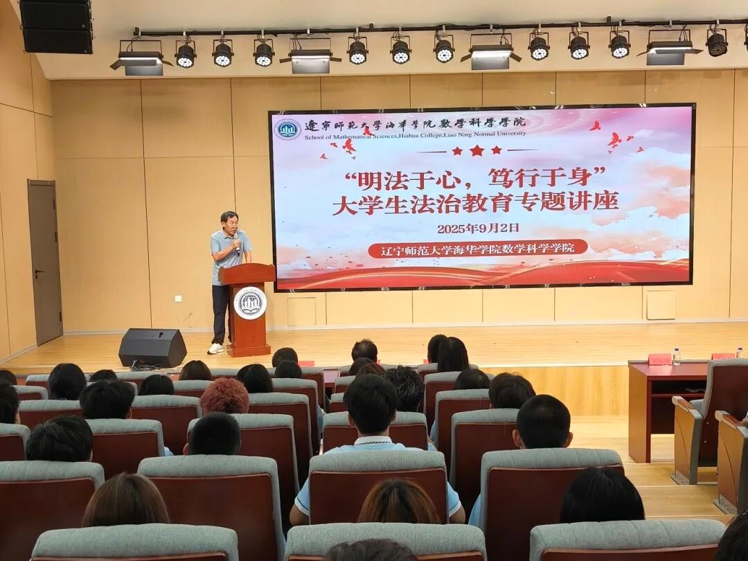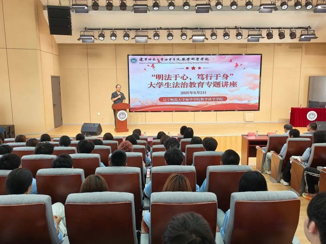 为增强大学生法治意识,提升刑事法律风险防范能力,2025年9月1日,辽宁师范大学海华学院数学科学学院联合大连市中级人民法院、庄河市人民法院相关嘉宾开展大学生法制教育座谈会,并于9月2日举办 “明法于心,笃行于身” 大学生法治教育专题讲座。大连市中级人民法院刑一庭副庭长裴宇、刑二庭法官助理付黎明、庄河市人民法院刑事审判庭法官刘洋受邀出席本次活动;辽宁师范大学海华学院数学科学学院院长钱伟懿、学生工作副院长陈晨、教学工作副院长孟海涛、辅导员郭纪薇及全体2025级新生参加本次讲座。